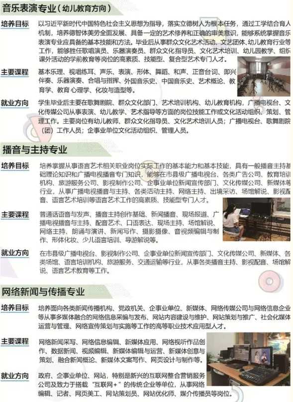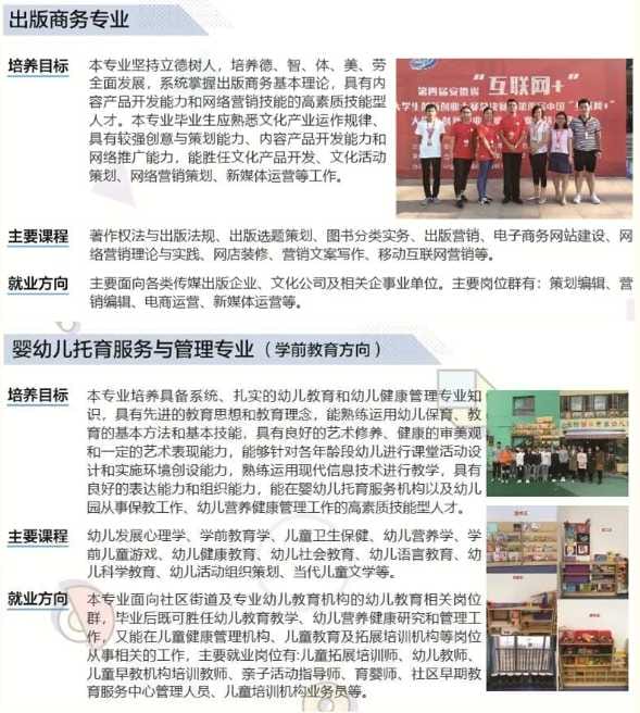 学院现有教职工300余人,学生8000余人,设有机电信息系、新闻传播系、艺术设计系、经济管理系、基础教学部、思想政治理论课教学部6个教学机构及实验实训中心、图书信息中心2个教辅机构。学院坚持以服务宣传文化领域经济建设和事业发展需要为宗旨,紧扣专业对接产业(链)的专业建设思路,现开设有新闻出版、印刷包装、艺术设计、经济管理、影视表演、文化教育、智能制造技术、信息技术等40个专业,其中国家级重点建设专业1个、省级重点建设专业9个、全国新闻出版行业示范专业1个、骨干专业2个。